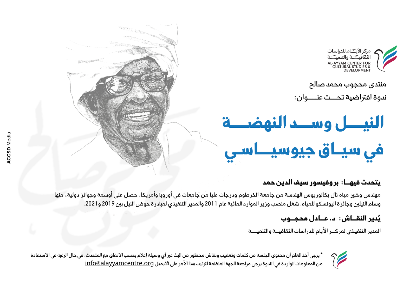 Join us for the second session of the Mahgoub Mohamed Salih Forum, a platform dedicated to promoting open, informed, and inclusive dialogue on critical national and regional issues. Speaker: Prof. Saif Al-Din Hamad – Former Minister of Water Resources and former Executive Director of the Nile Basin Initiative.